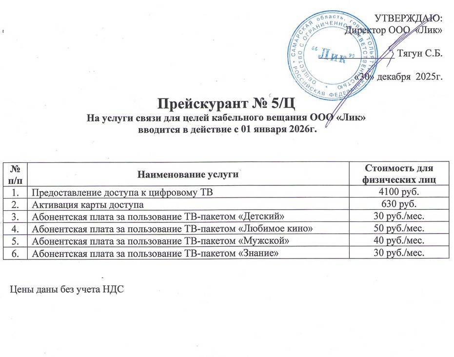 Прейскурант действует с 01.10.2024г. Цены даны без учета НДС